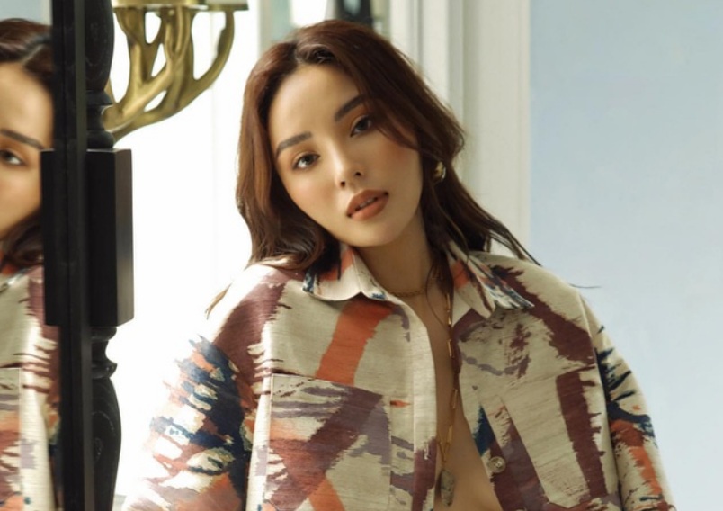 Bên cạnh dùng để diện khi dạo phố, son cam đất cũng thích hợp cho sự kiện hay dạ tiệc sang trọng. Khánh Vân trang điểm theo phong cách hiện đại, dùng phấn highlight bắt sáng làm làn da trông rạng rỡ, căng mịn trước ống kính. Ảnh: @khanhvannguyen25.